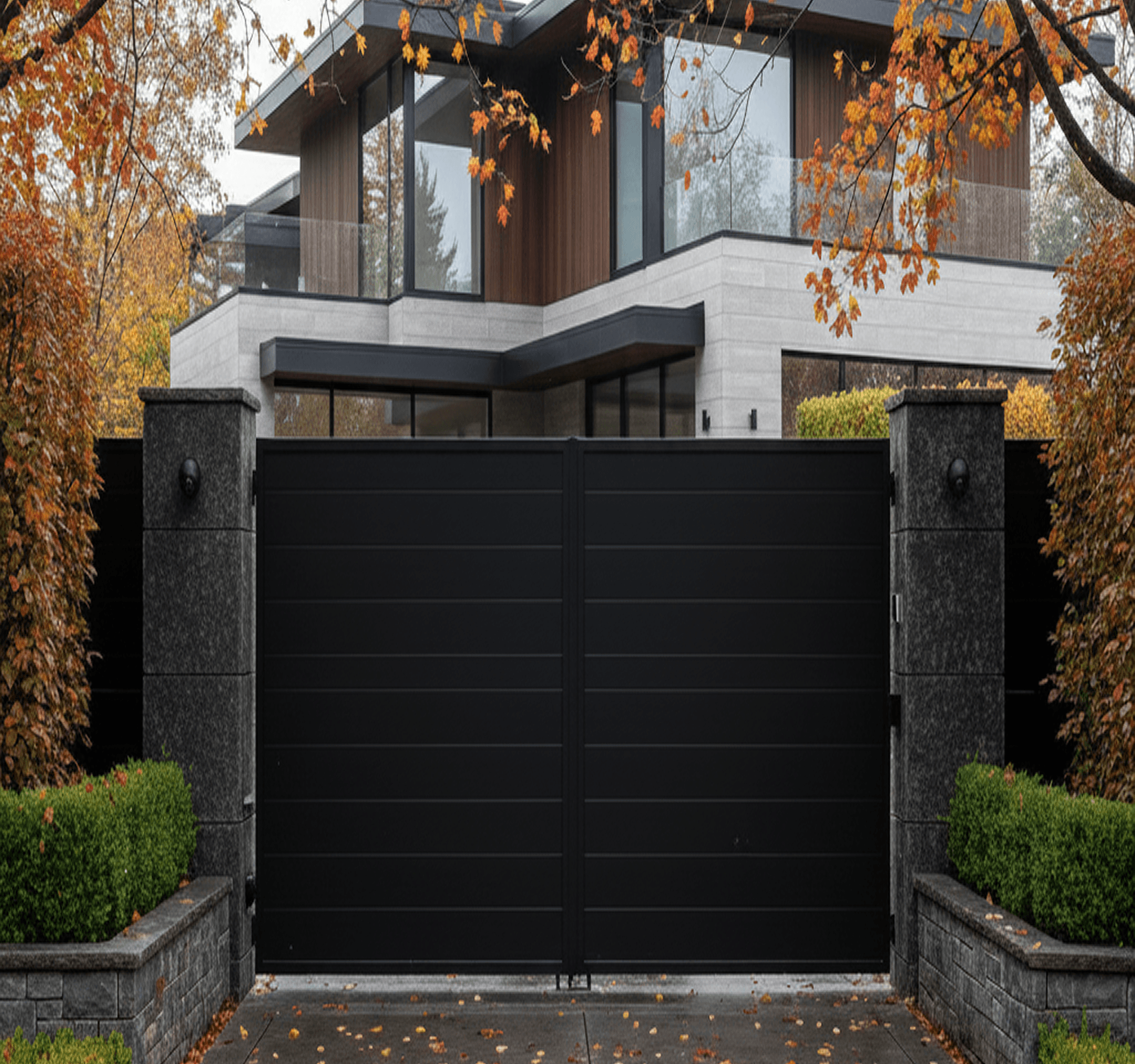 Lights activate for 30 mins at night when cars access. Sensors report to an Alarm Receiving Centre if gates are open late.